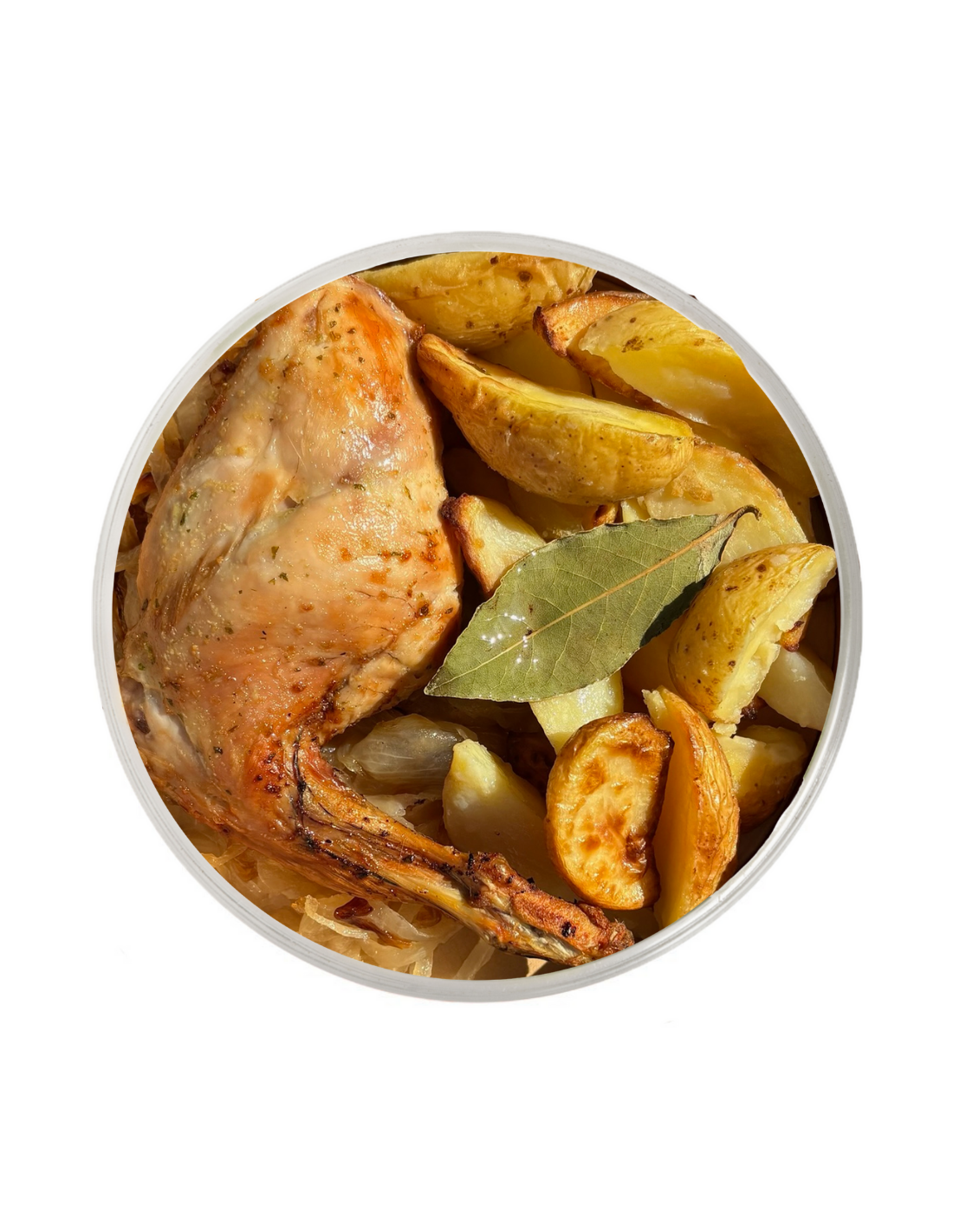 Conill tendre rostit lentament, acompanyat de patates daurades que absorbeixen els sucs del rostit i ceba caramel·litzada que aporta un toc dolç i equilibrat. Un plat casolà, aromàtic i lleuger, elaborat amb ingredients reals i de sabor autèntic.