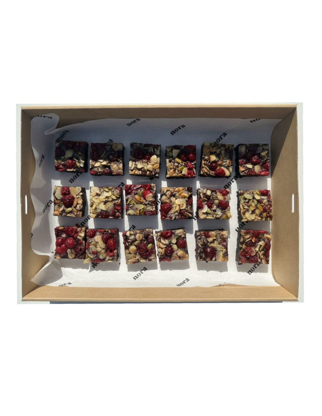 Ingredients: 70% xocolata, sucre de canya, ou, oli d'oliva verge extra, fècula de blat de moro, farina d'arròs, cacau i sal, fruits secs