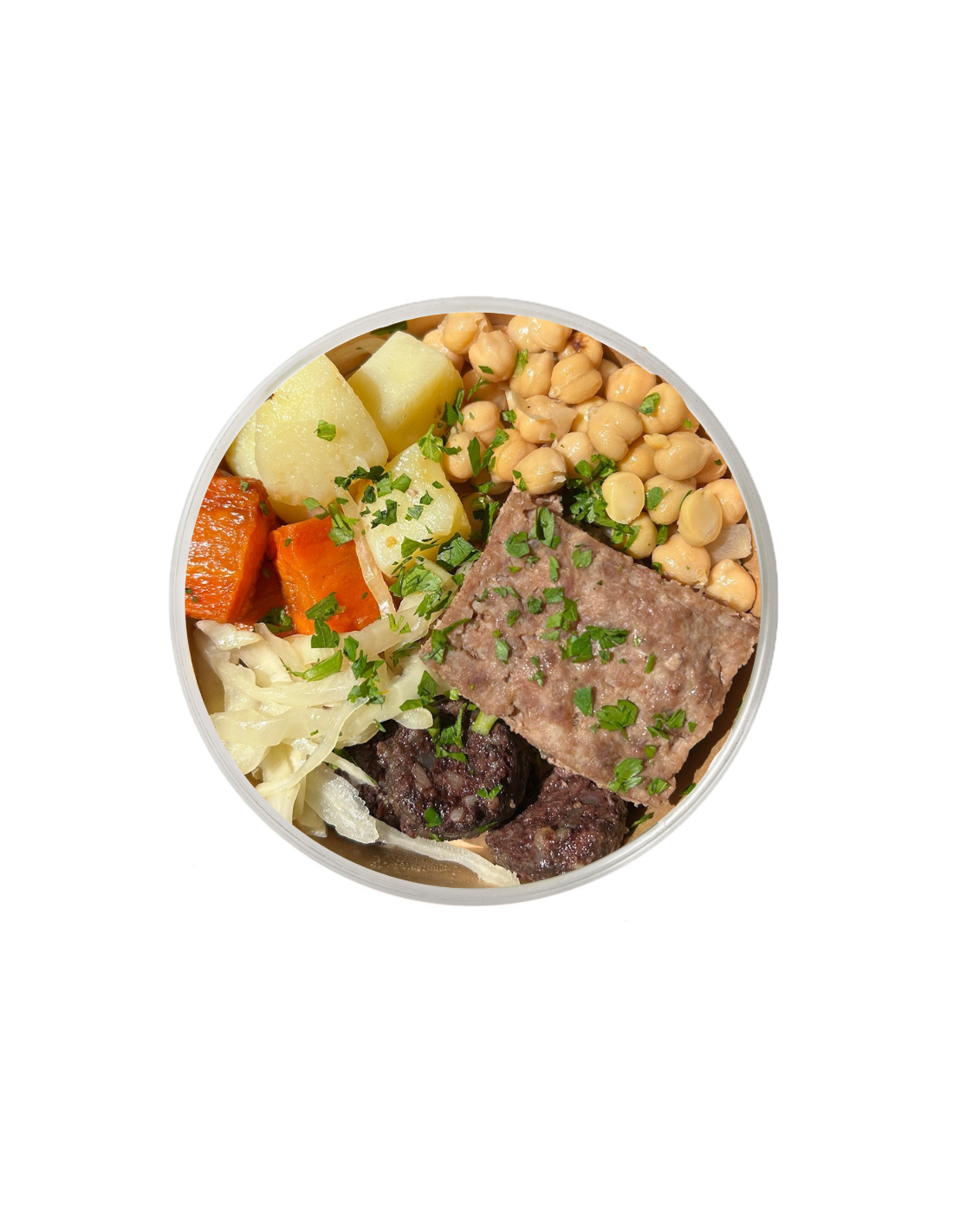 L’essència de l’escudella, portada a la seva forma més pura: sense brou, però amb tota la seva ànima. Carns seleccionades, cigrons i verdures cuinades a foc lent per oferir un sabor autèntic i reconfortant.