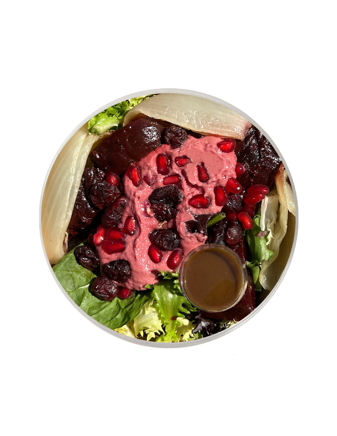 La nostra amanida Rubí és una explosió de color i frescor. La remolatxa n’és la protagonista, combinada amb un hummus de remolatxa cremós, magrana i nabius deshidratats per crear una barreja vibrant, dolça i plena de vida. Una amanida tan bonica com saborosa, feta amb ingredients reals i pensada per fer-te sentir bé.