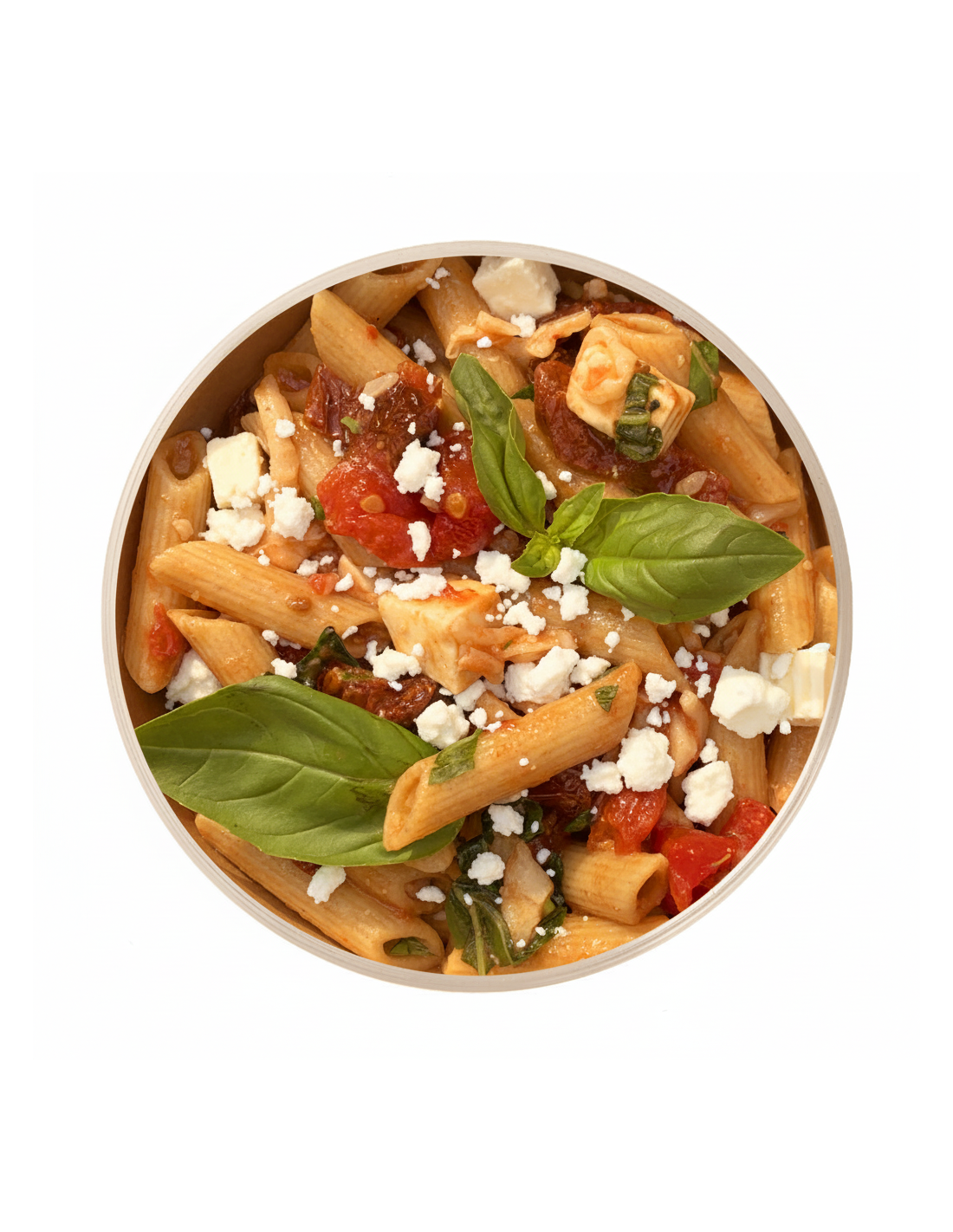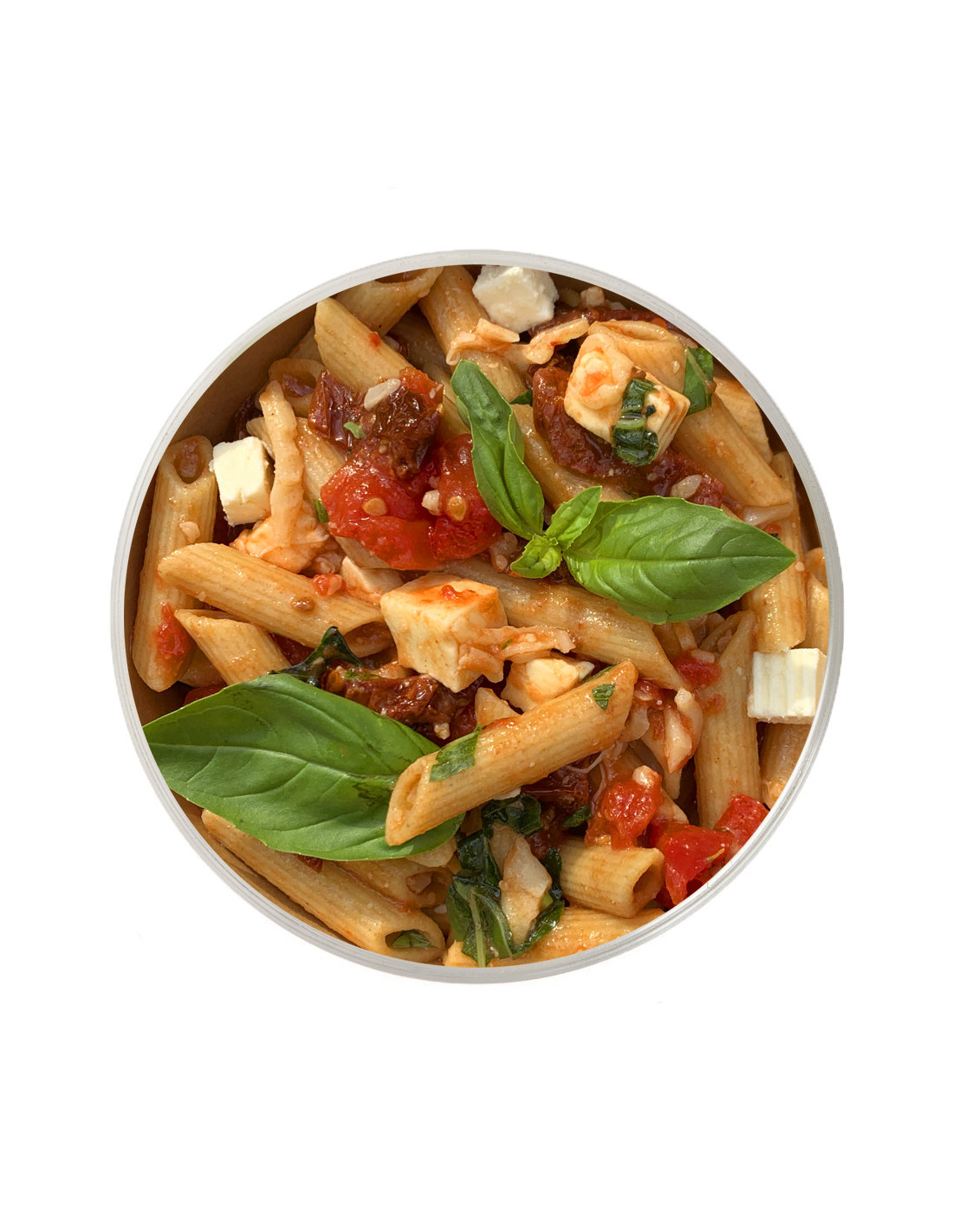 Aquest és un plat de pasta molt saborós i aromàtic gràcies als seus pocs ingredients. Utilitzarem pasta integral i la barrejarem amb formatge feta vegà i alfàbrega.