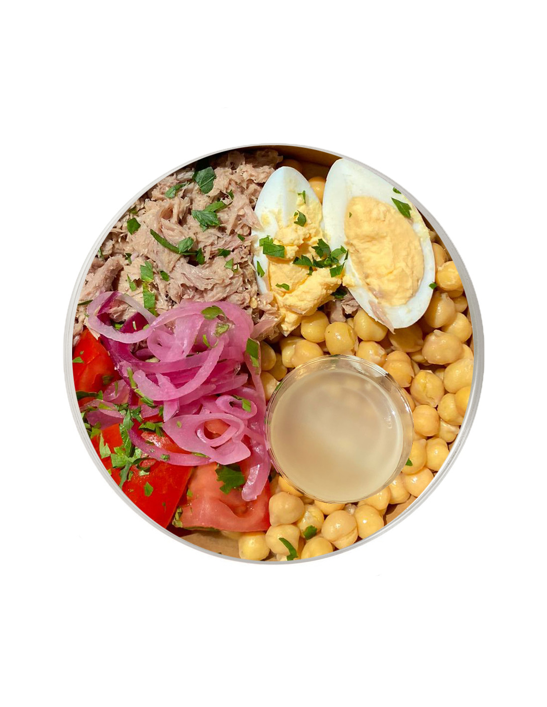 Aquesta és una amanida freda i saludable per gaudir d’un plat molt complet. Els ingredients bàsics que no fallen: cigrons, ou, tonyina, ceba en vinagre i tomàquet.