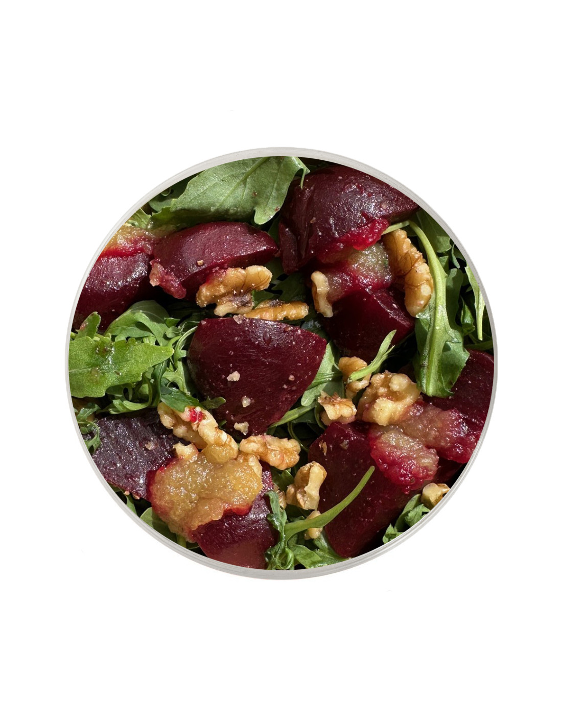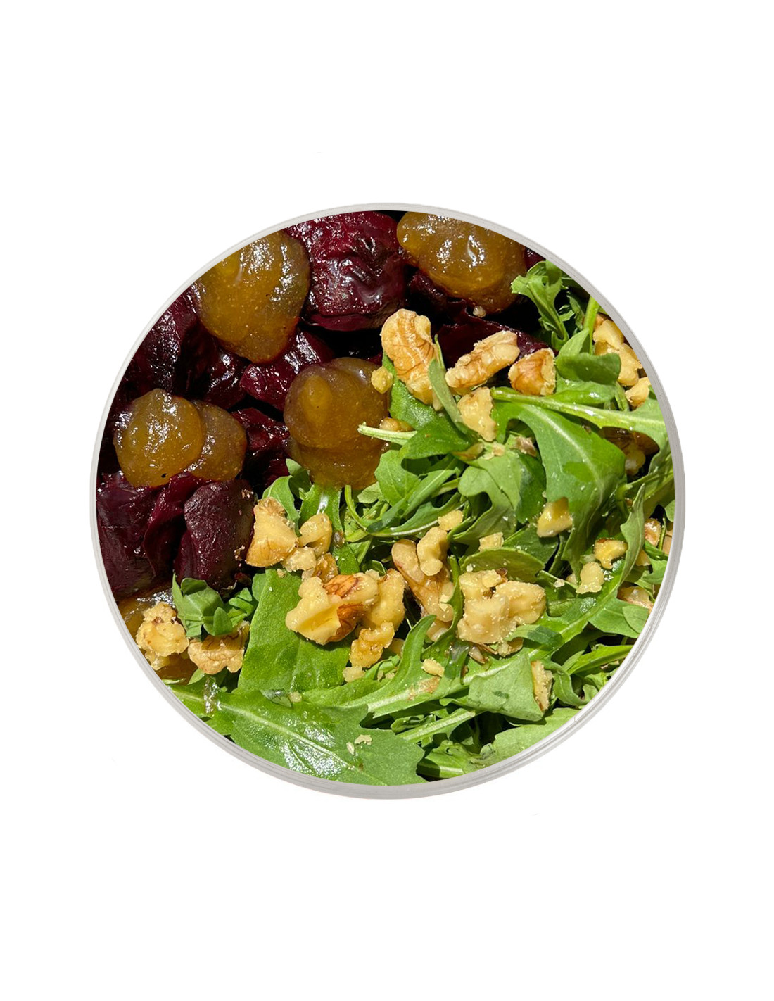 Dolça, fresca i cruixent: remolatxa, compota de poma, rúcula i nous es combinen en una amanida plena de sabor i energia natural.