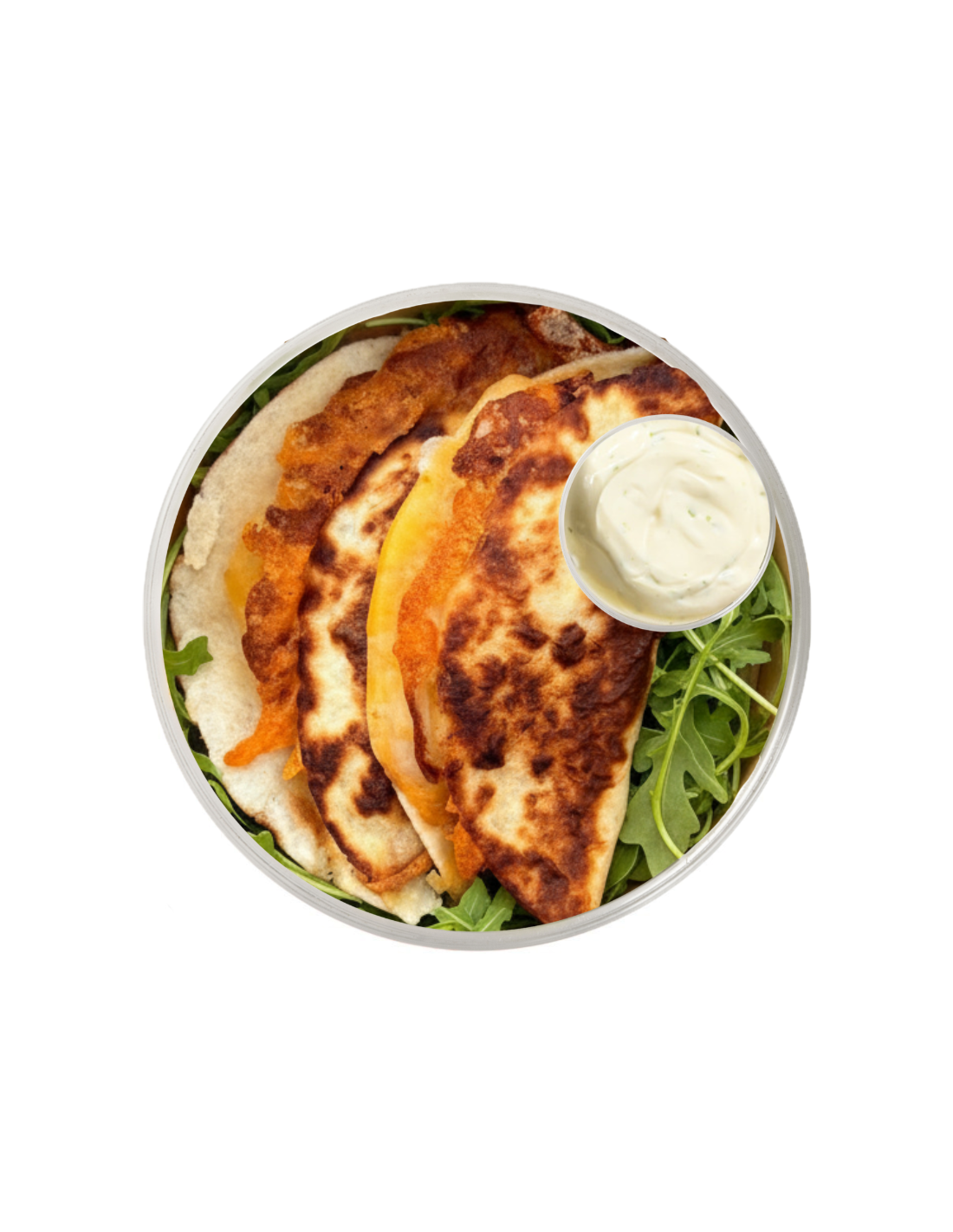 Quesadilla de pollastre sucós, acompanyada d’una cremosa salsa de coriandre i crema àcida. Un mos ple de sabor, fresc i reconfortant.