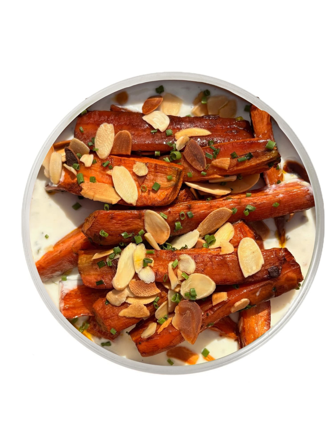 Pastanaga fresca amanida amb oli alt oleic i un toc de vinagre de Mòdena que realça la seva dolçor natural. Acompanyada d'una suau salsa de iogurt vegà amb llimona i orenga, i coronada amb ametlla per aportar un contrast cruixent irresistible. Una combinació lleugera, equilibrada i plena de sabor.