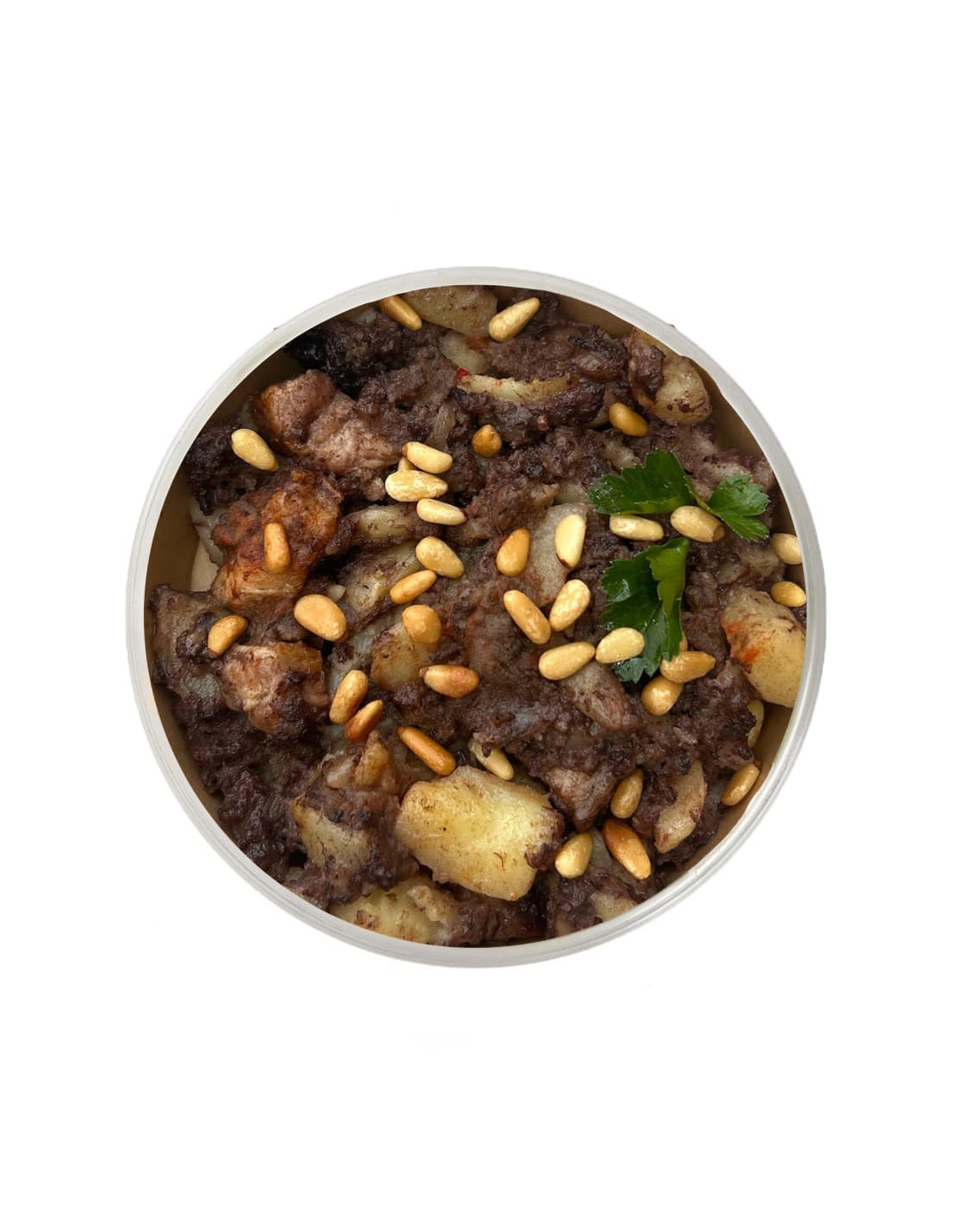 Traditional potato dish with black sausage and pancetta, rich in flavour and creamy in texture, inspired by authentic Catalan cuisine. Finished with pine nuts for that homemade taste.