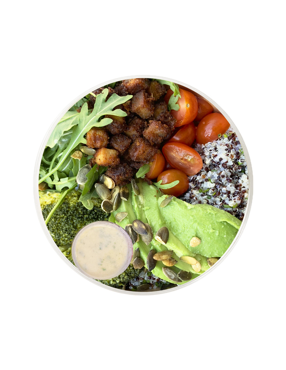 This is a very complete vegan bowl. We marinate the tofu in soy sauce and lots of spices to give it flavor. This bowl is accompanied by rice, edamame, radish, and a touch of sriracha :)