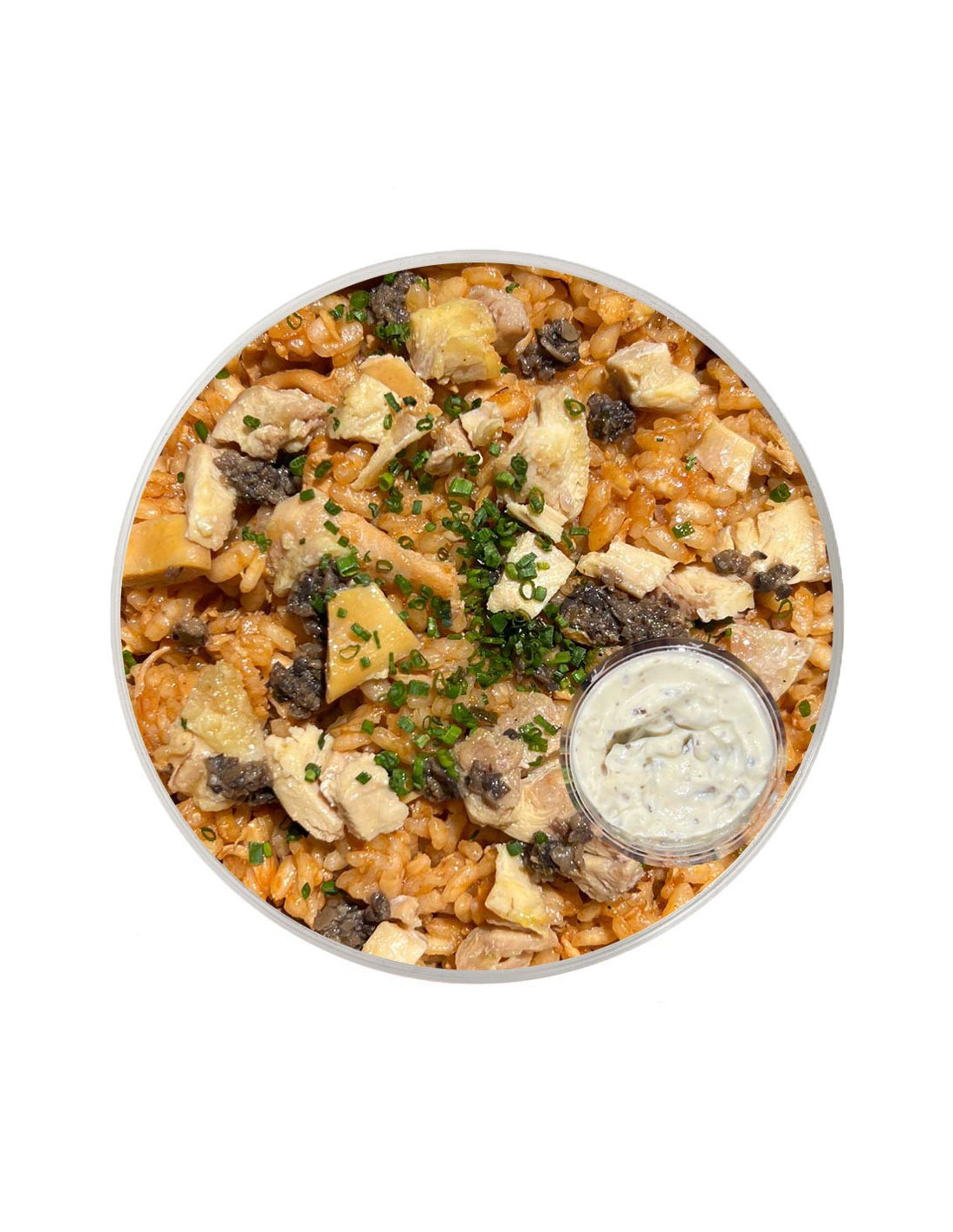Es una receta que nos enamoró cuando la probamos, un arroz seco con pollo y ese toque a trufa tan característico.