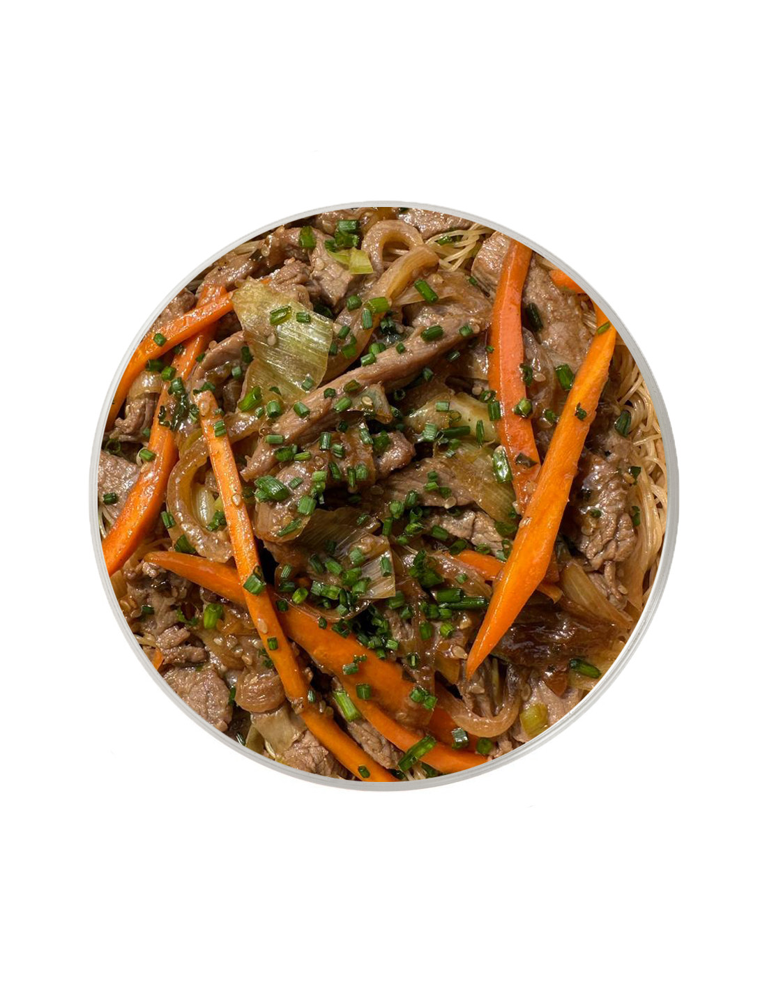 Tiras de ternera salteadas al estilo coreano, acompañadas de una guarnición de fideos de arroz que absorben todo el sabor del salteado. El plato se perfuma con un delicado toque de aceite de sésamo, aportando notas tostadas y aromáticas que elevan cada bocado.