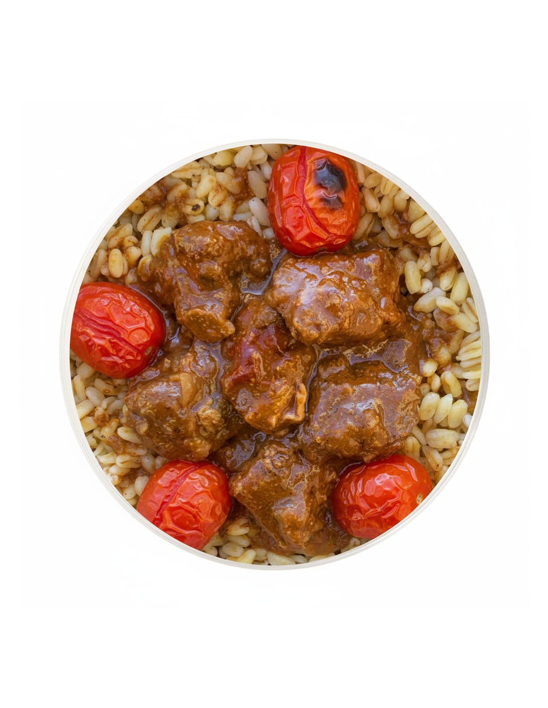 De guarnición cous cous tierno especiado con hierbas y cherry.