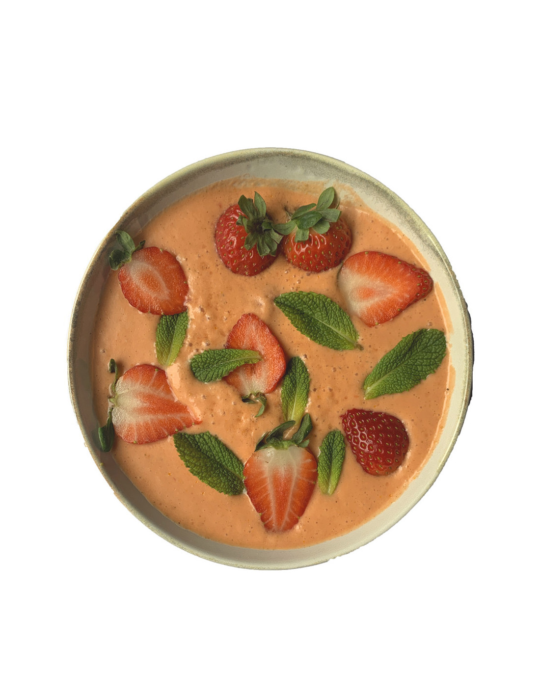 Fresquito, con fresón y tomate...Es suave pero con todo el aroma de la fresa, y por supuesto aderezado con finas hierbas, nuestras inseparables compañeras.