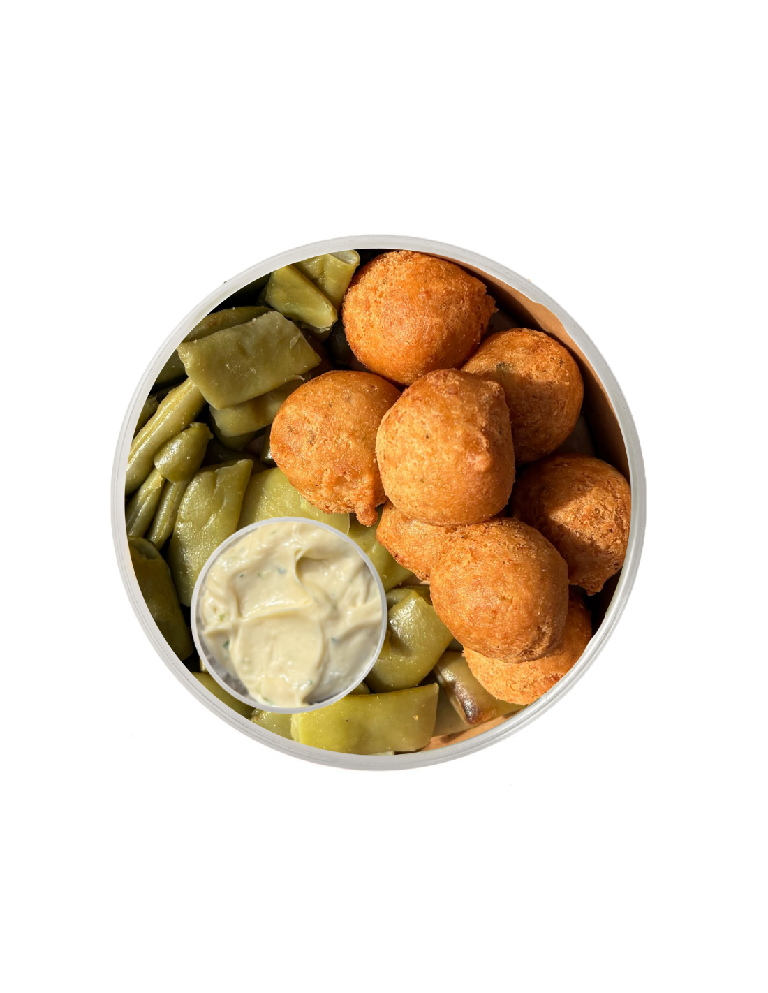 Crujientes buñuelos de bacalao, dorados por fuera y suaves por dentro, acompañados de judías verdes frescas y una cremosa mayonesa de ajo y perejil. Un plato sabroso, equilibrado y con esencia mediterránea.